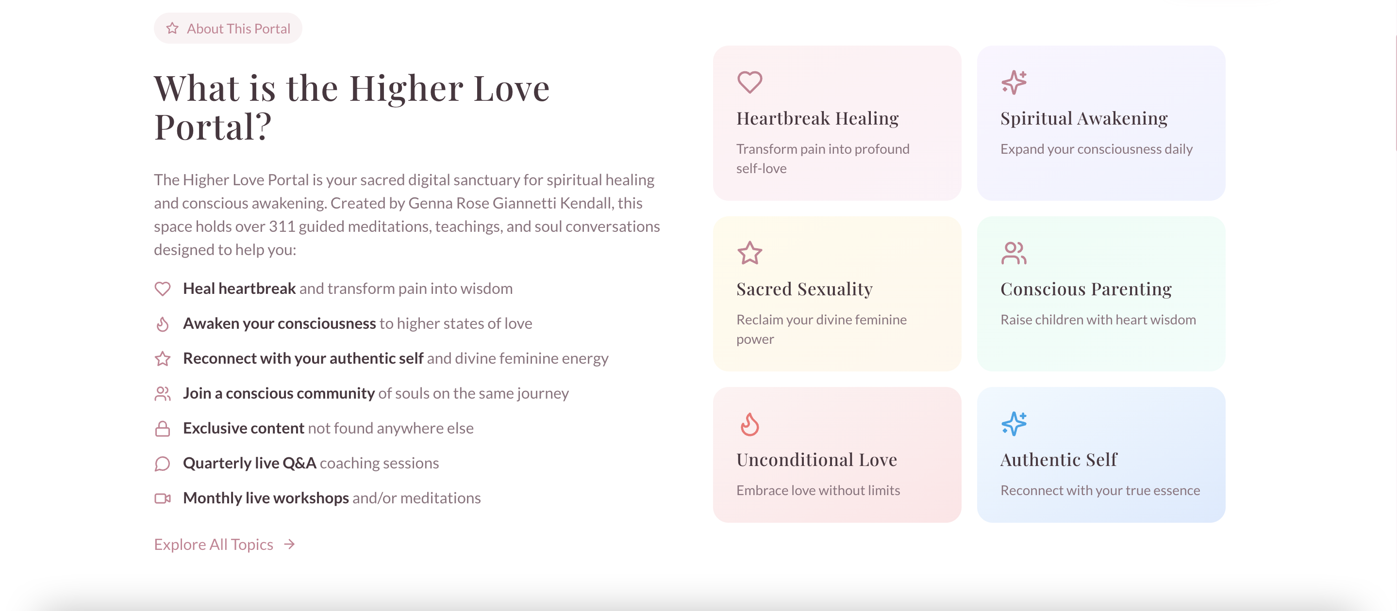 Your sacred space for healing, awakening, and unconditional love. This portal offers over 309 guided sessions across 17 healing topics — from heartbreak healing to sacred sexuality, conscious parenting, and spiritual awakening.